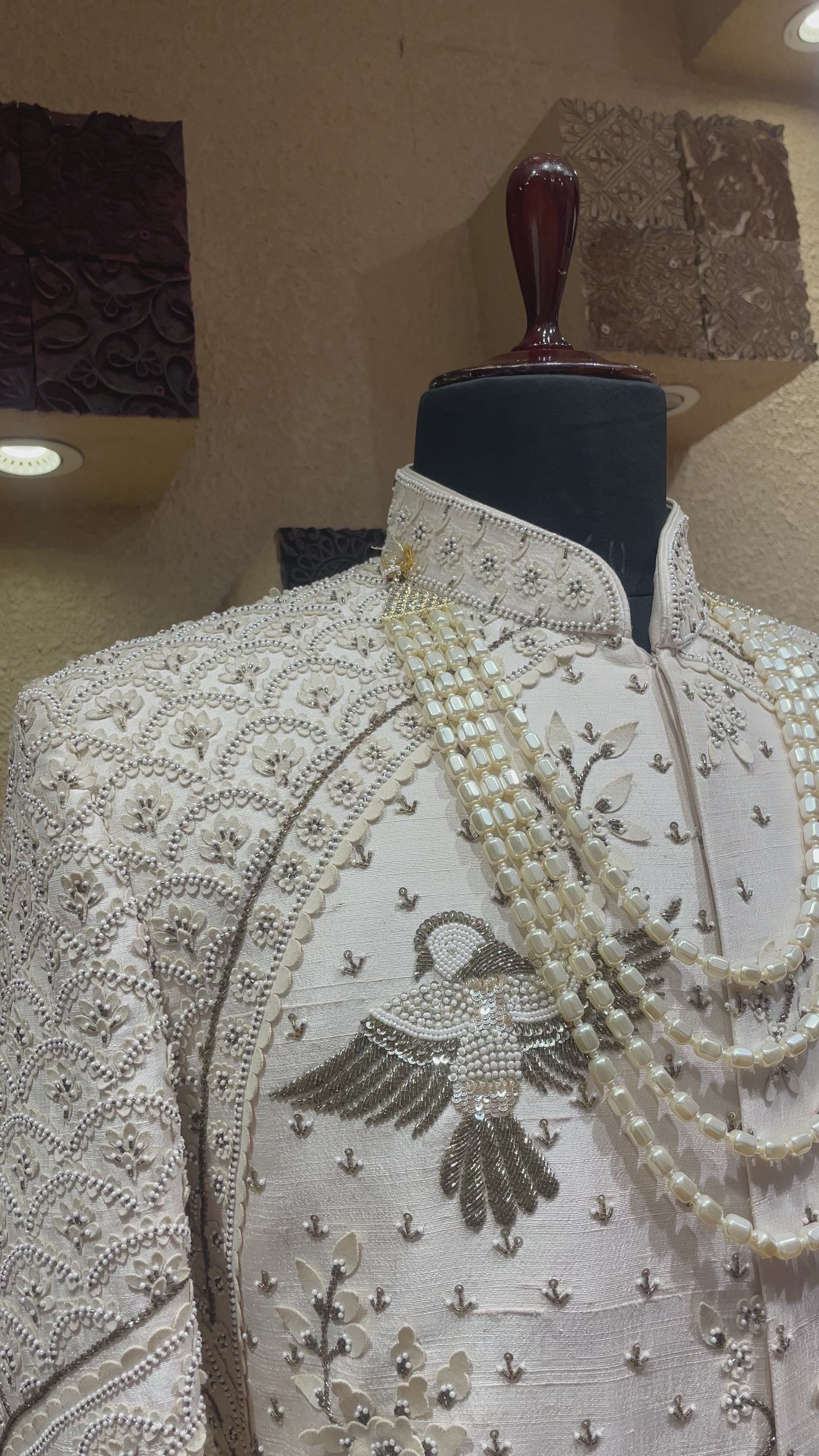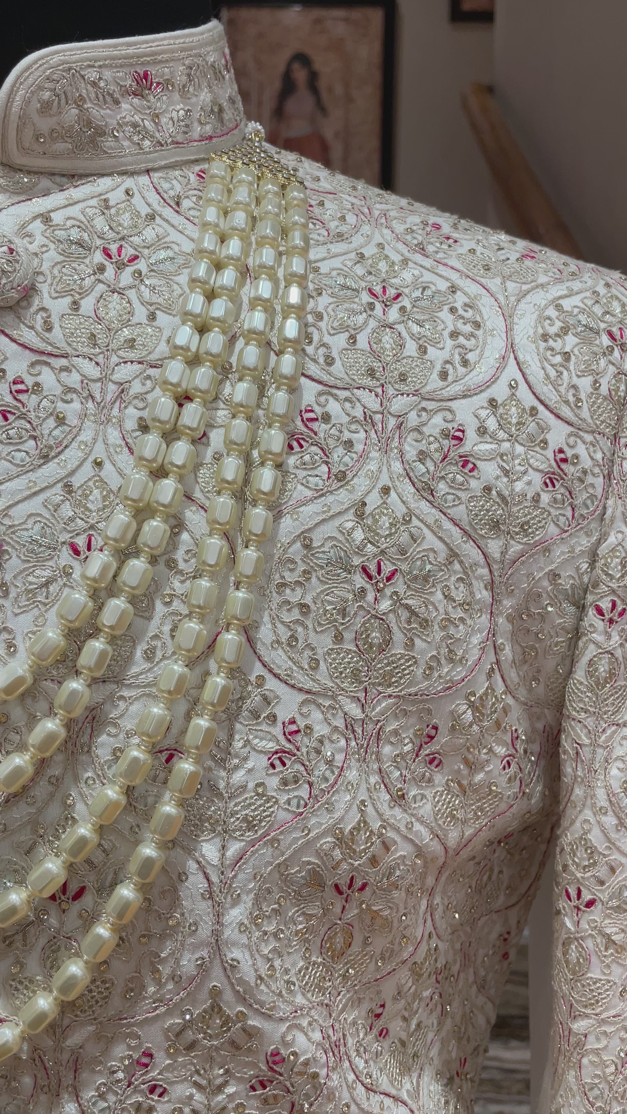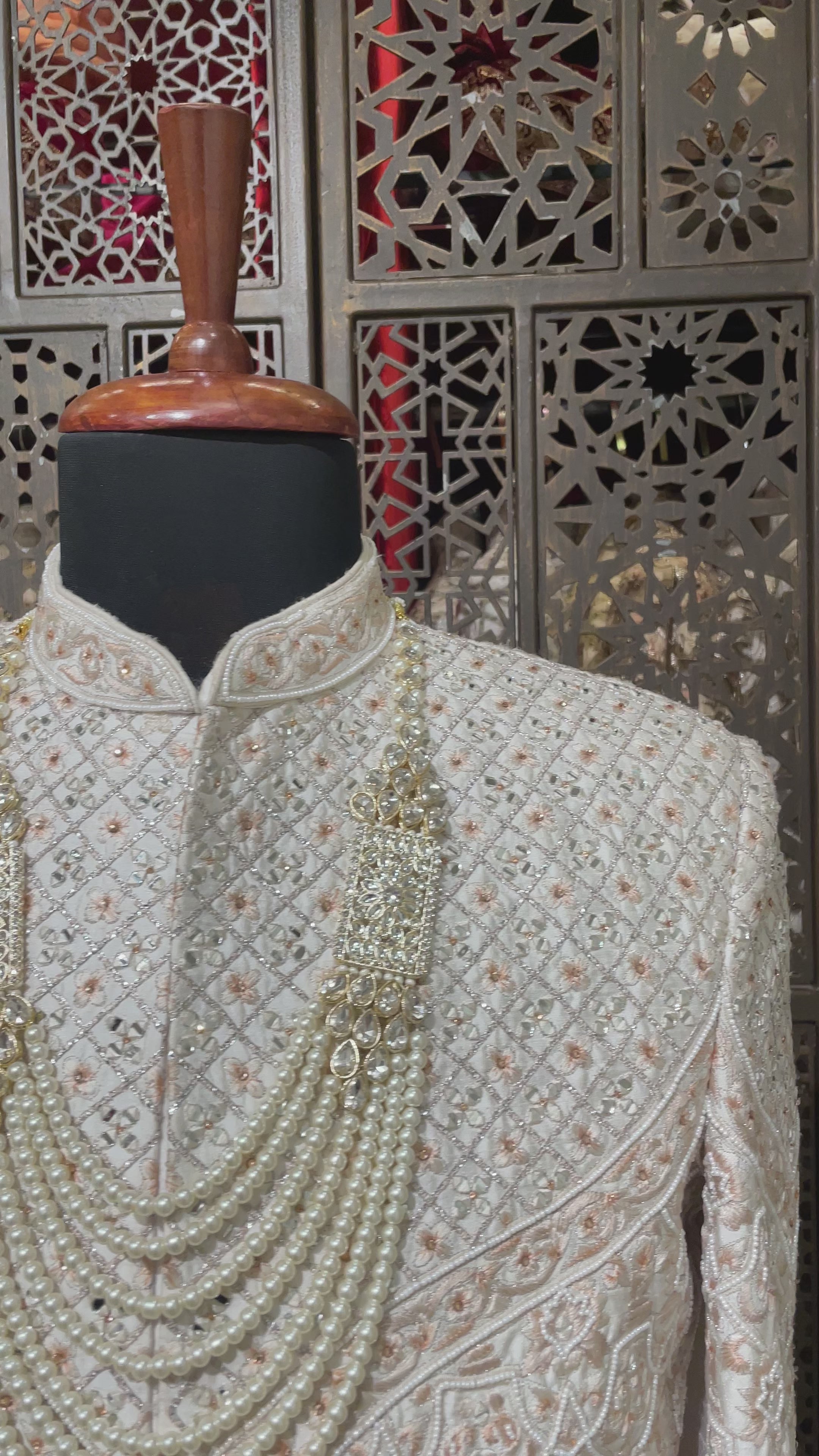 Ivory silk men’s sherwani with pearl and cutdana embellishments