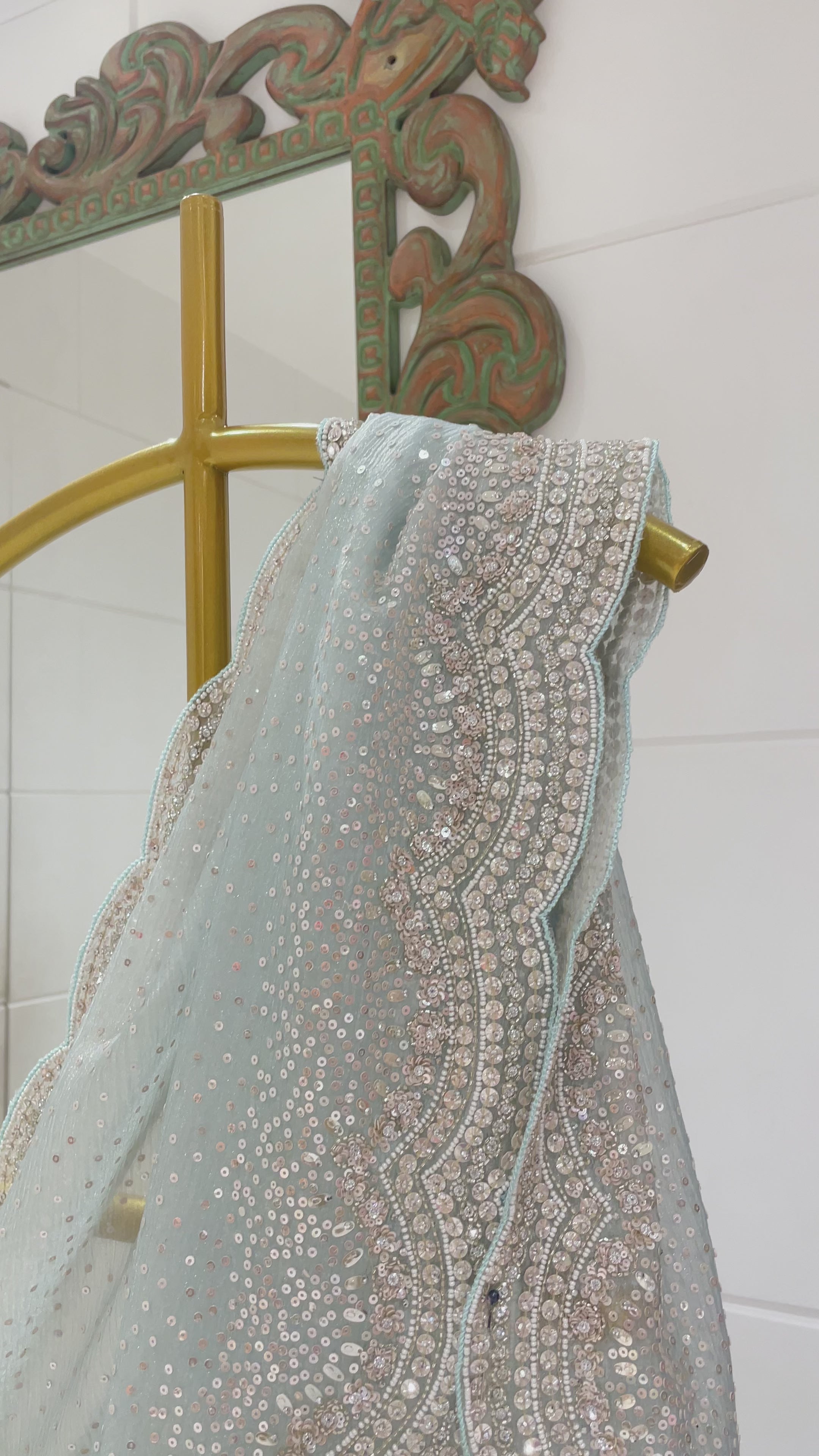 Light blue saree with zig-zag borderLight blue saree with zig-zag border