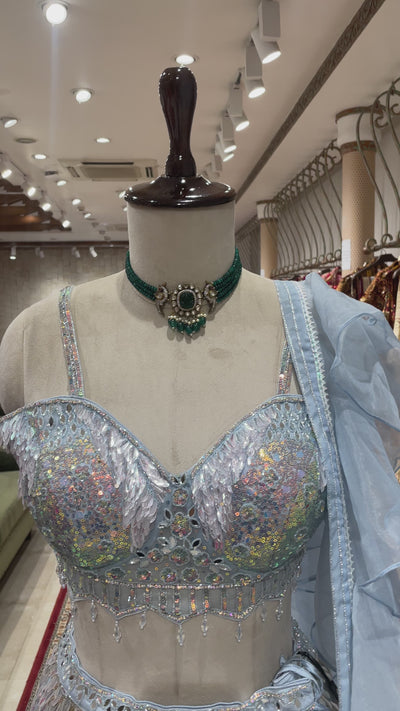 This Pastel Blue Lehenga with Floral Motifs is a graceful and charming outfit, perfect for making a subtle yet striking statement at any special event.