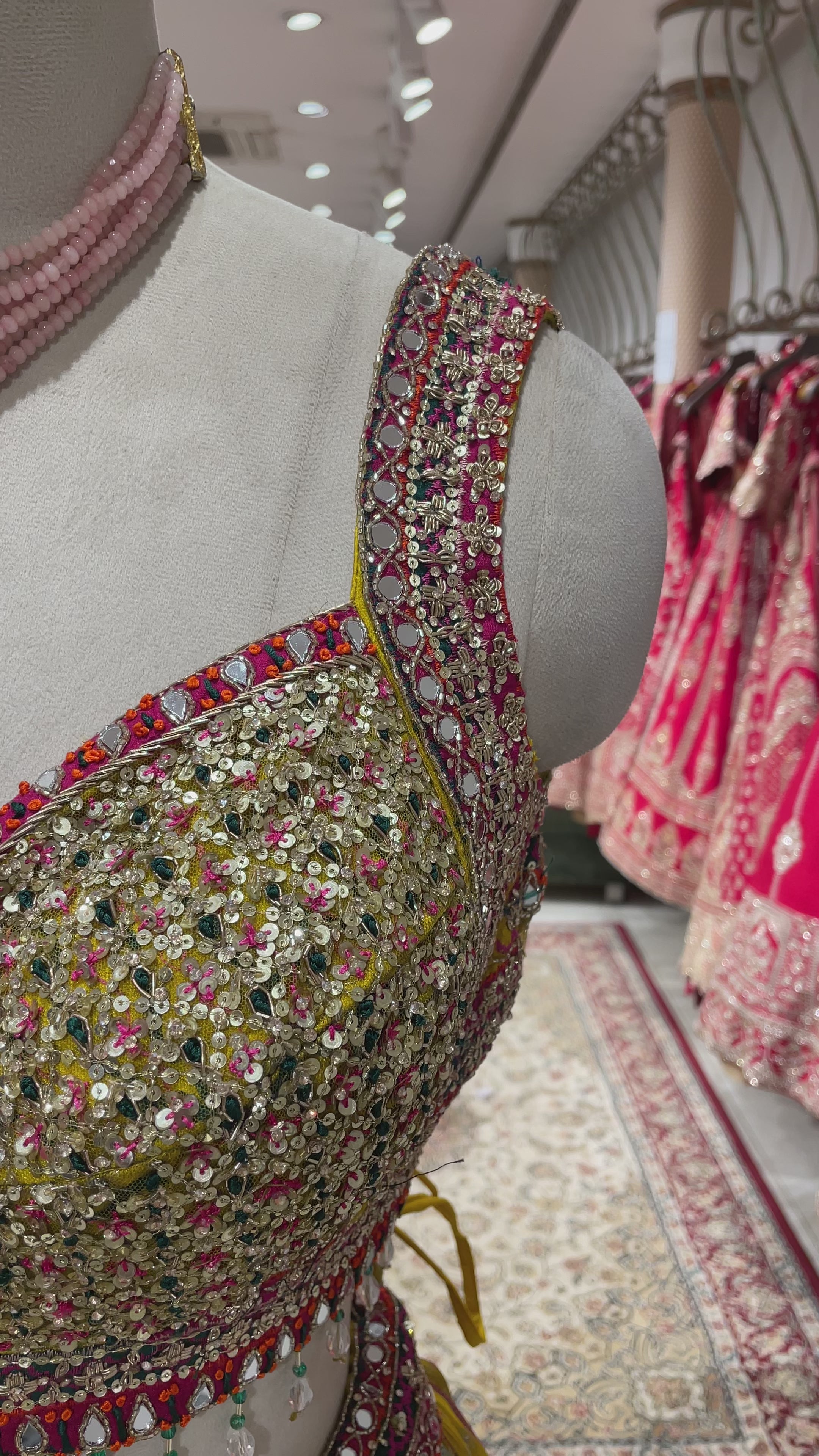 Sold outFloral cape style lehenga with multicolour Mirrorwork