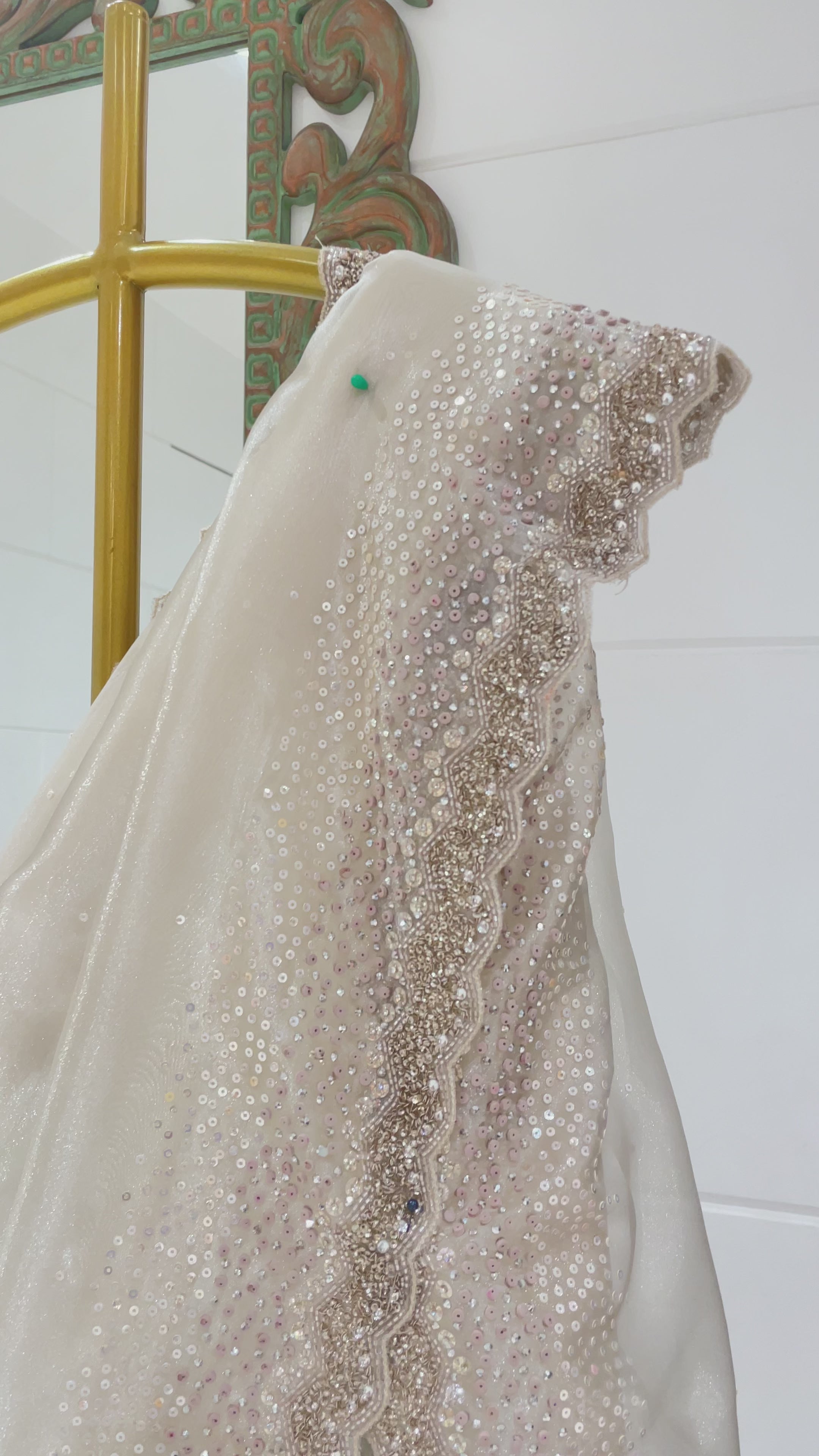 This Ivory Tissue Organza Saree embodies timeless elegance with its delicate sheen and luxurious feel, making it an exquisite choice for any grand occasion.