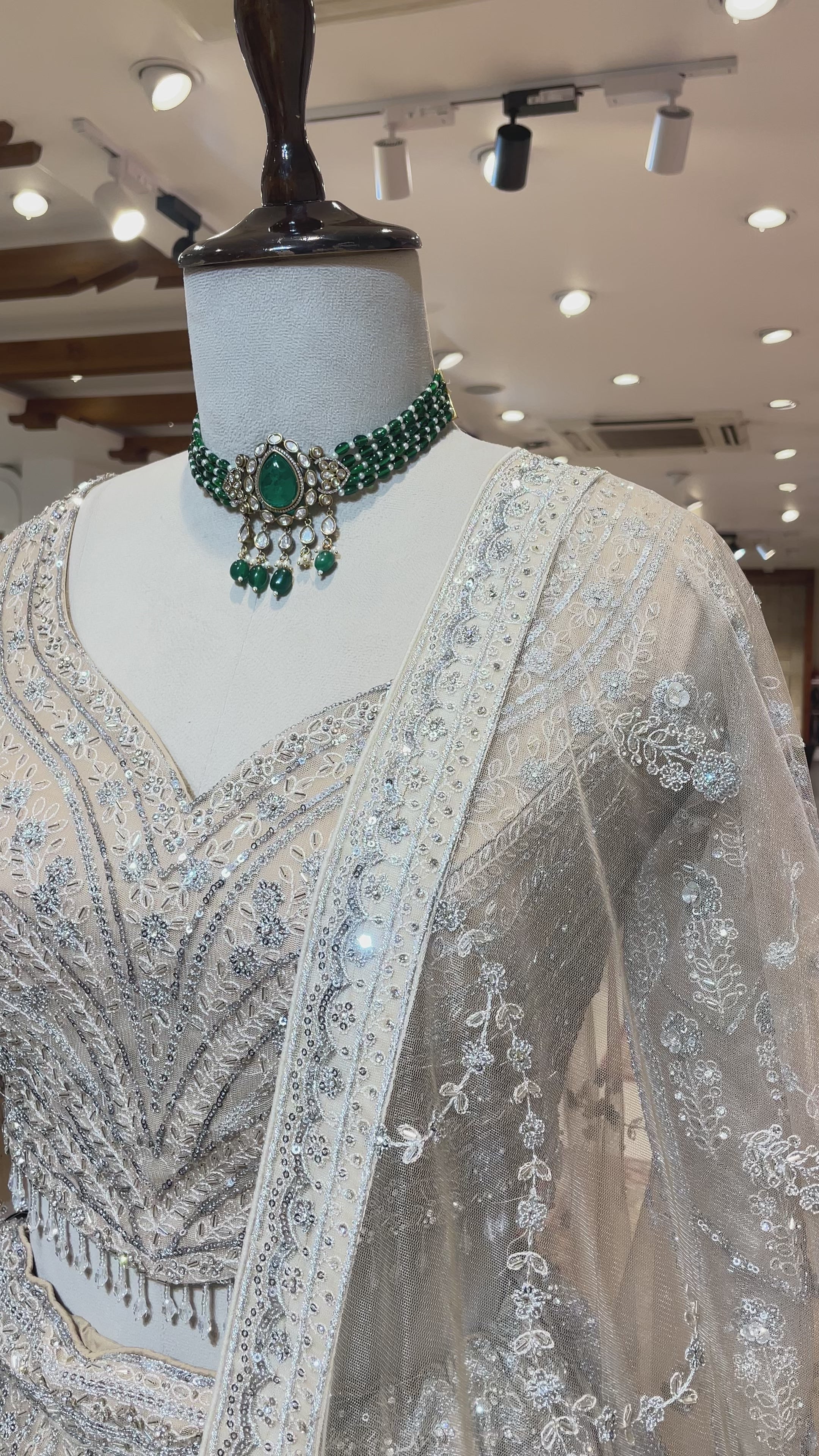 This cream net lehenga, adorned with shimmering sequins, exudes grace and sophistication, making it a timeless choice for any special occasion.