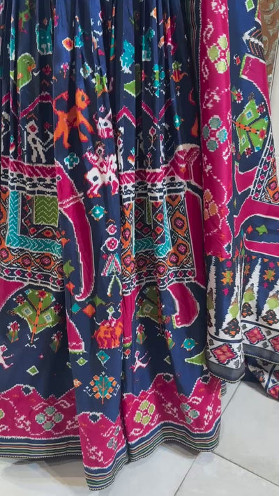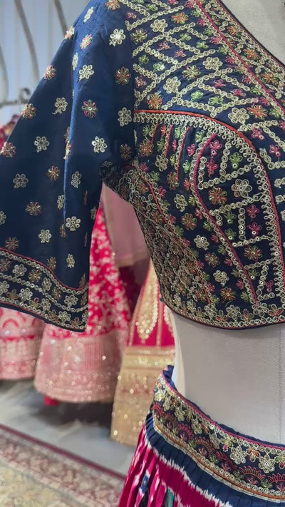 Striking dark blue lehenga featuring elegant all-over prints for a modern ethnic statement