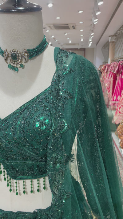 This emerald green lehenga, adorned with sparkling sequins, exudes sophistication and charm, making it perfect for any special occasion where elegance is a must.