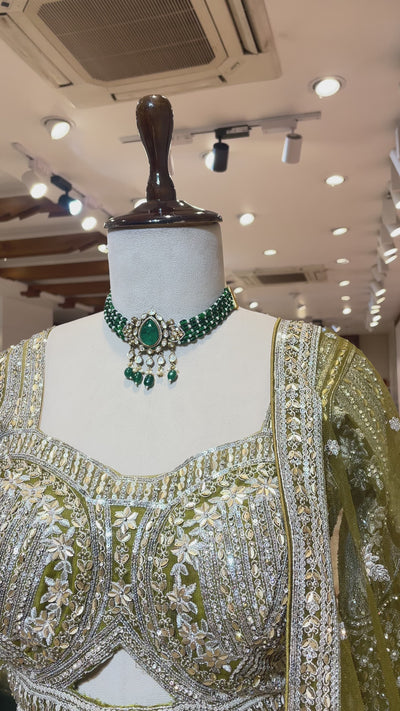 This green net lehenga, highlighted with exquisite silver embellishments, captures the essence of refined elegance, making it an ideal choice for special celebrations.
