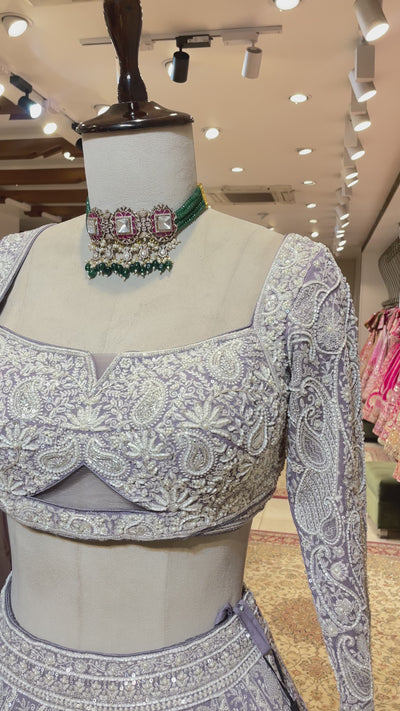 This lavender Georgette lehenga, with its intricate chikankari paisley buti work, seamlessly blends traditional artistry with contemporary elegance, making it an ideal choice for special occasions.