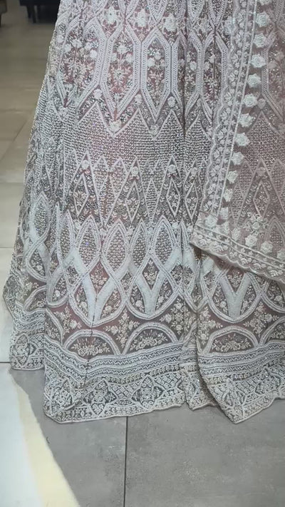 Soft peach lehenga beautifully adorned with intricate white thread embroidery for a graceful and elegant look