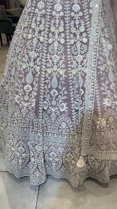 Gorgeous pink lehenga adorned with intricate floral motifs, adding a fresh and elegant charm