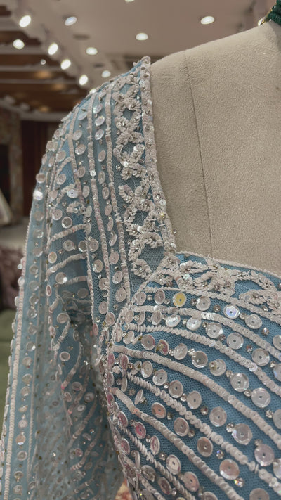 This powder blue lehenga, enhanced with delicate white sequins, radiates charm and grace, making it the perfect ensemble for those seeking understated elegance.