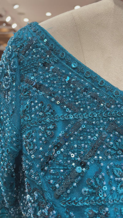This teal blue lehenga with sequins detailing offers a sophisticated yet eye-catching look, ideal for those who want to make a statement with elegance.