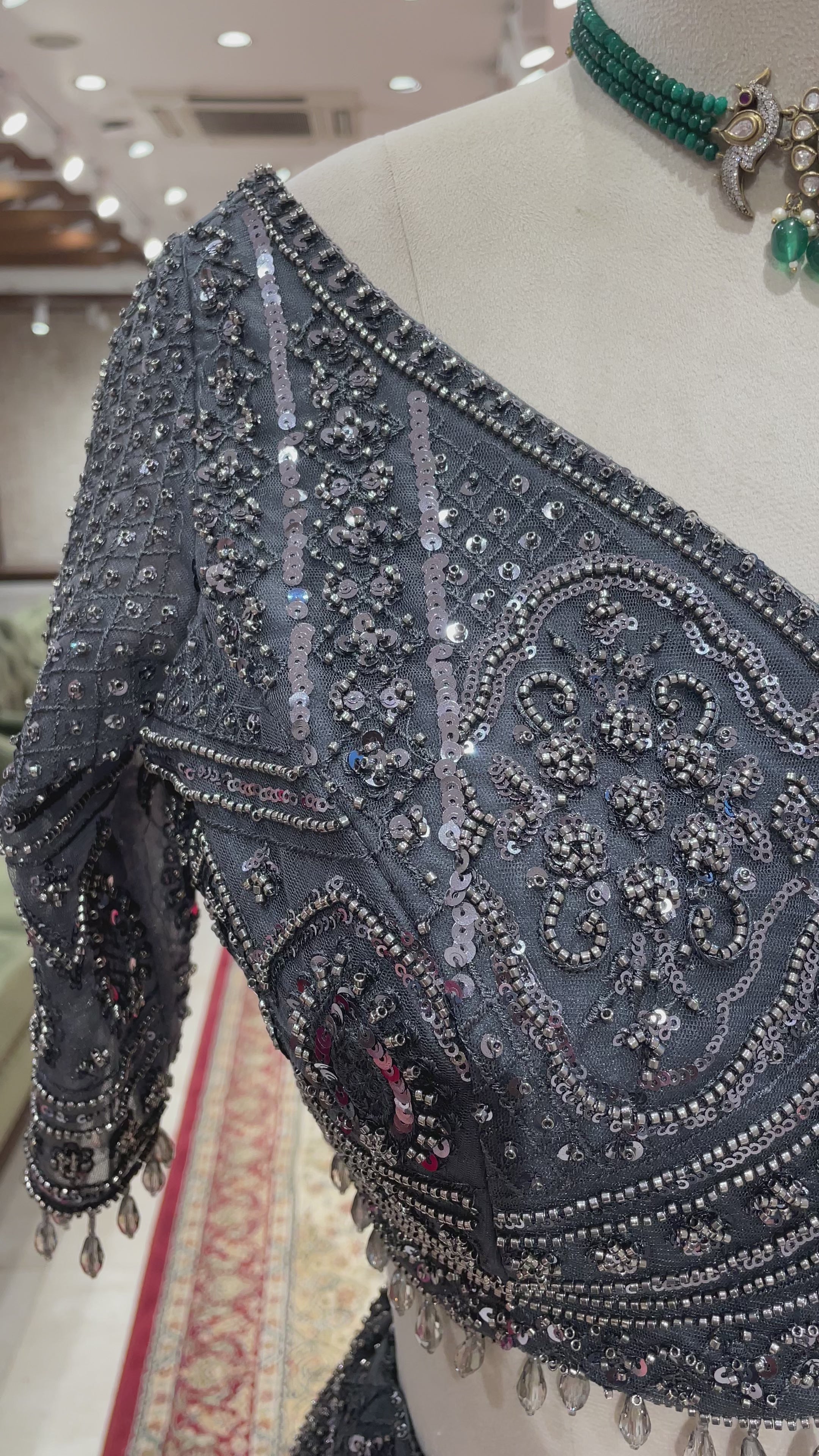This grey sequins lehenga exudes elegance with a hint of sparkle, making it a versatile choice for sophisticated occasions.