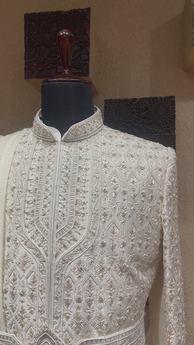 Cream silk layered sherwani with embellishments