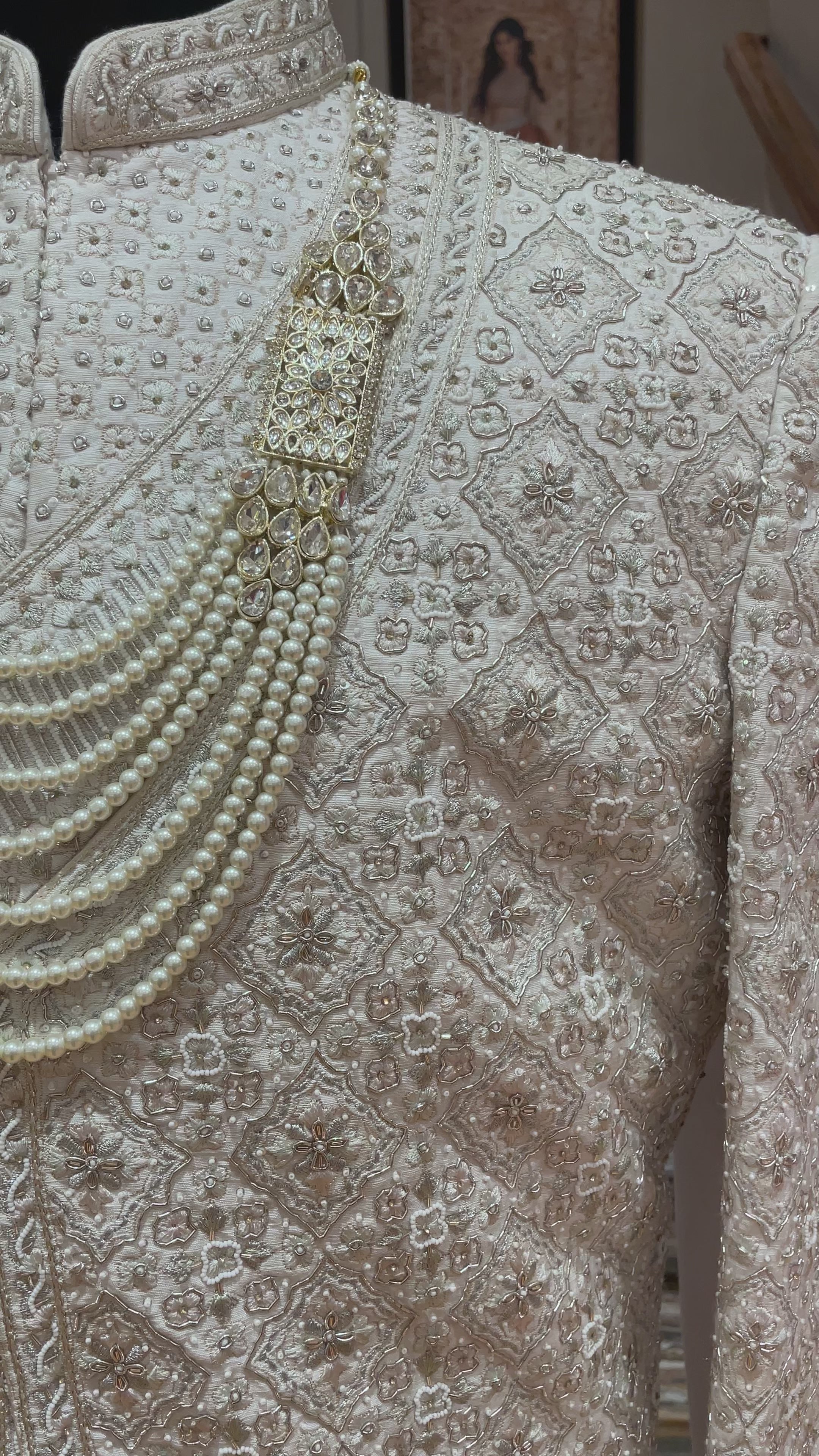 This cream silk sherwani with luxurious gold and silver embellishments exudes elegance, making it perfect for weddings, receptions, and grand occasions.