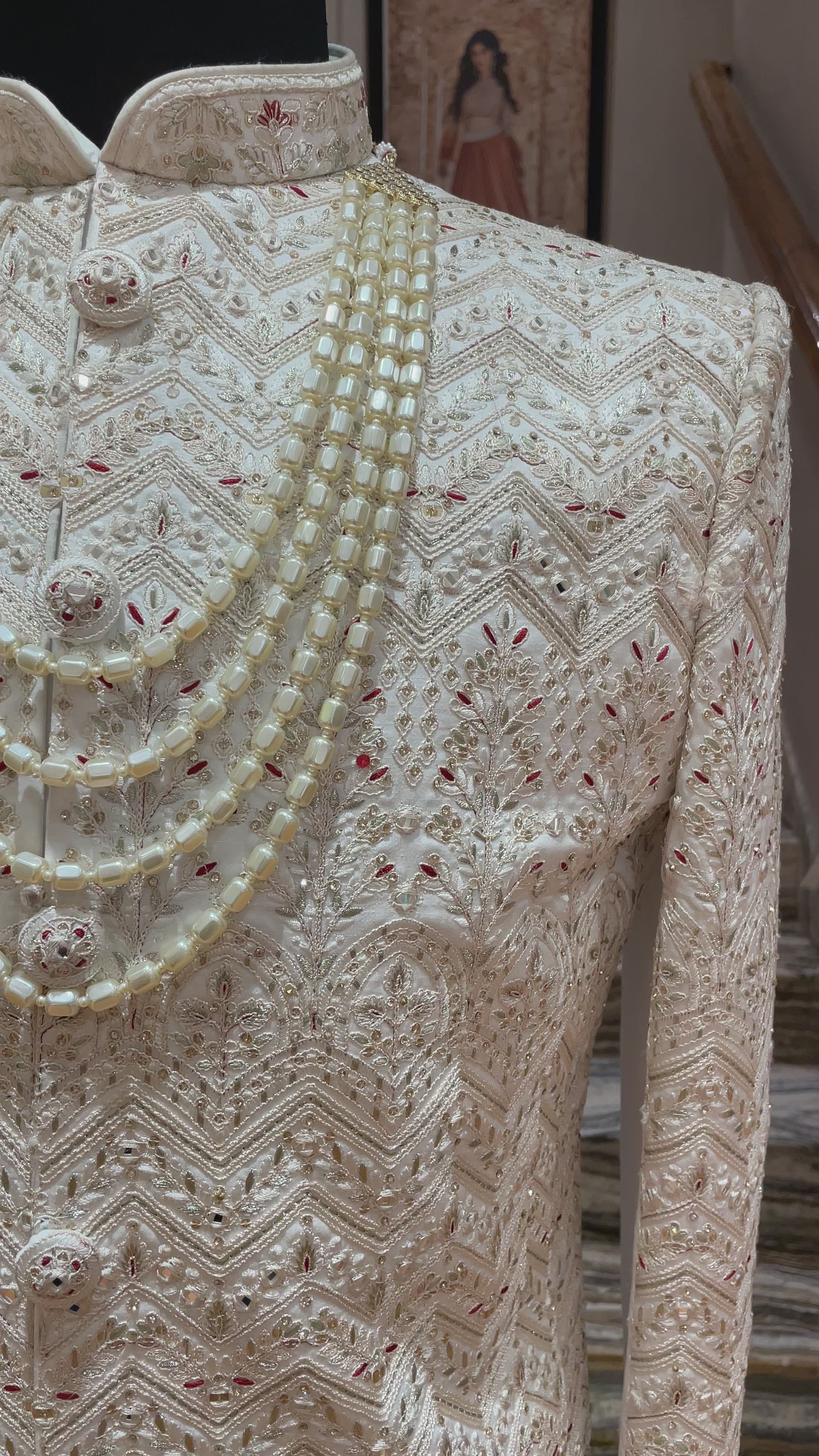 - Design: Traditional sherwani silhouette, adorned with intricate motifs and patterns in vibrant red and gold tones