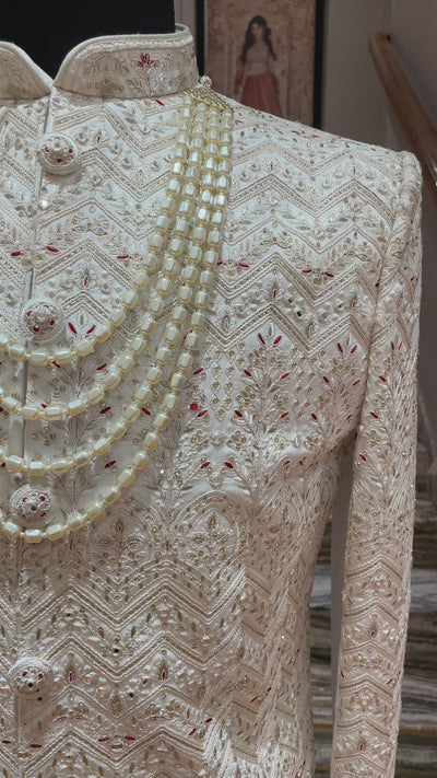 Cream silk sherwani with red and gold embroidery