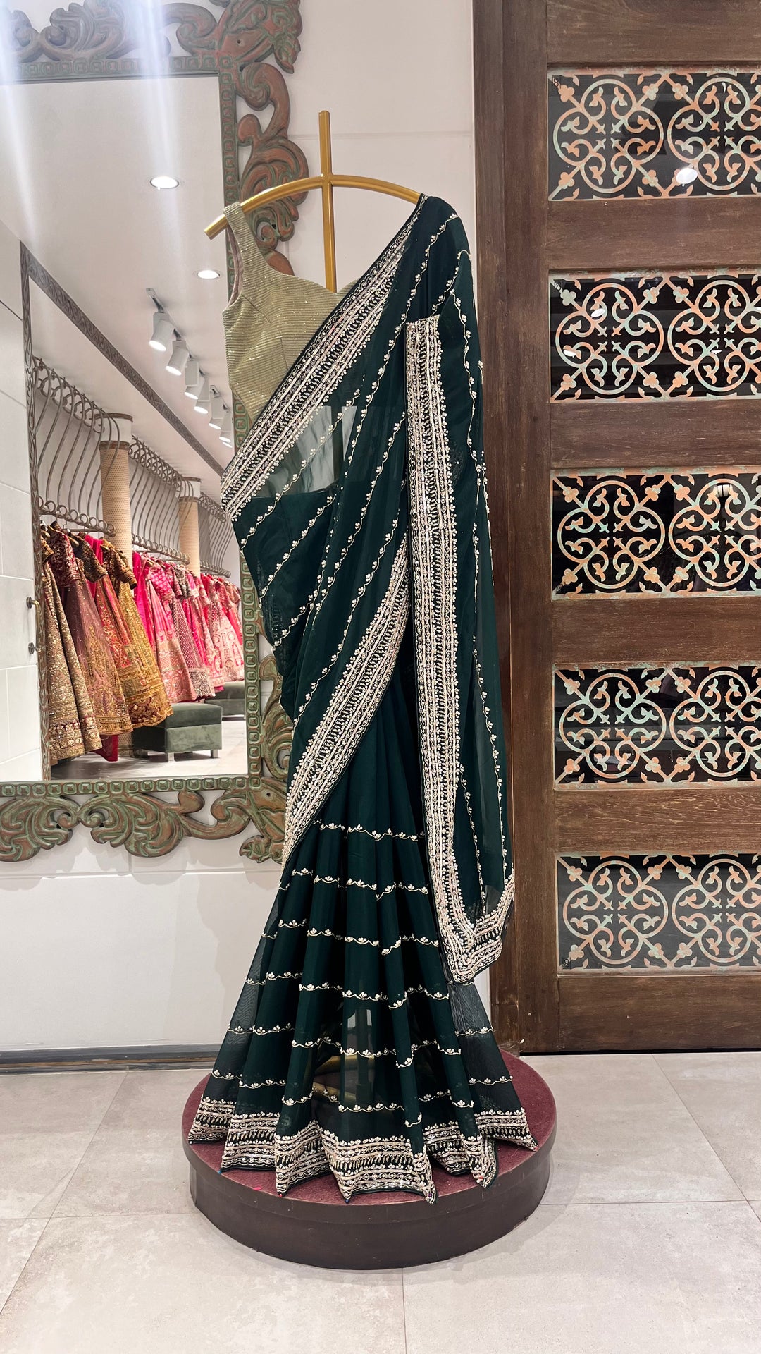Indulge in the luxurious charm of our Green Saree embellished with complementary gold work, and let your attire reflect the richness of Indian heritage and culture. Embrace the allure of golden elegance and step into the spotlight with confidence and poise.