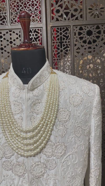 Ivory silk men’s sherwani with pearl and cutdana embellishments
