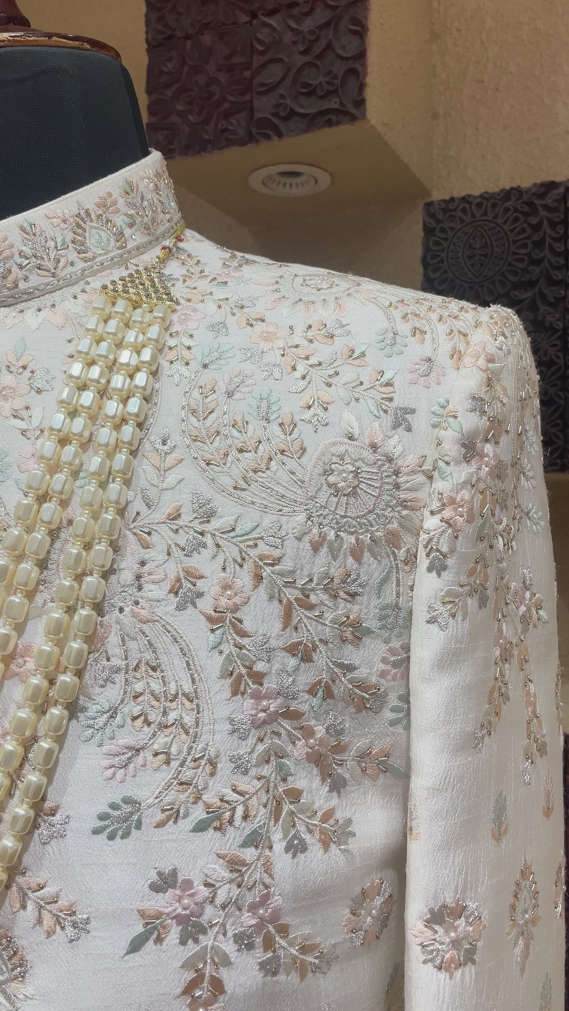 - Embellishments: Intricate floral motifs beautifully embroidered across the sherwani, adding a touch of elegance.