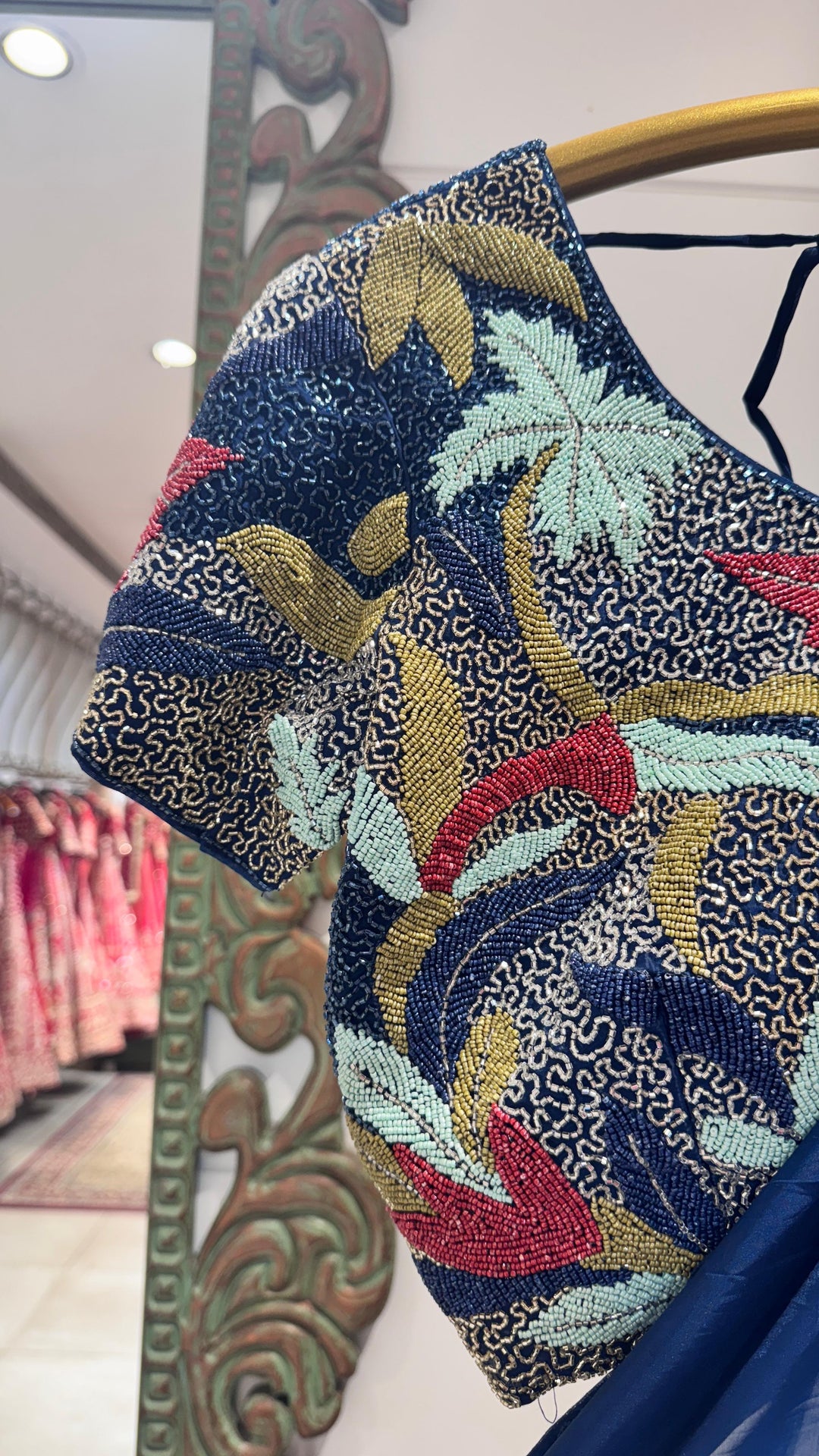 The saree includes a matching blouse fabric in teal, which can be styled to your preference—from a minimalist sleeveless blouse to a structured boat neck with sequin detailing. Personalize the blouse with additional sequins, sheer panels, or statement backs to elevate the ensemble.